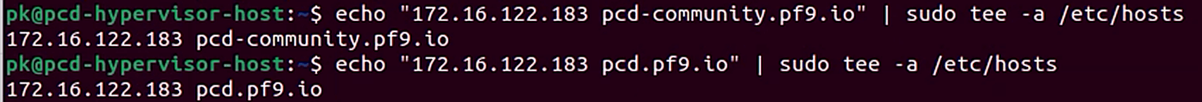 echo "172.16.122.183 pcd-community.pf9.io" | sudo tee -a /etc/hosts