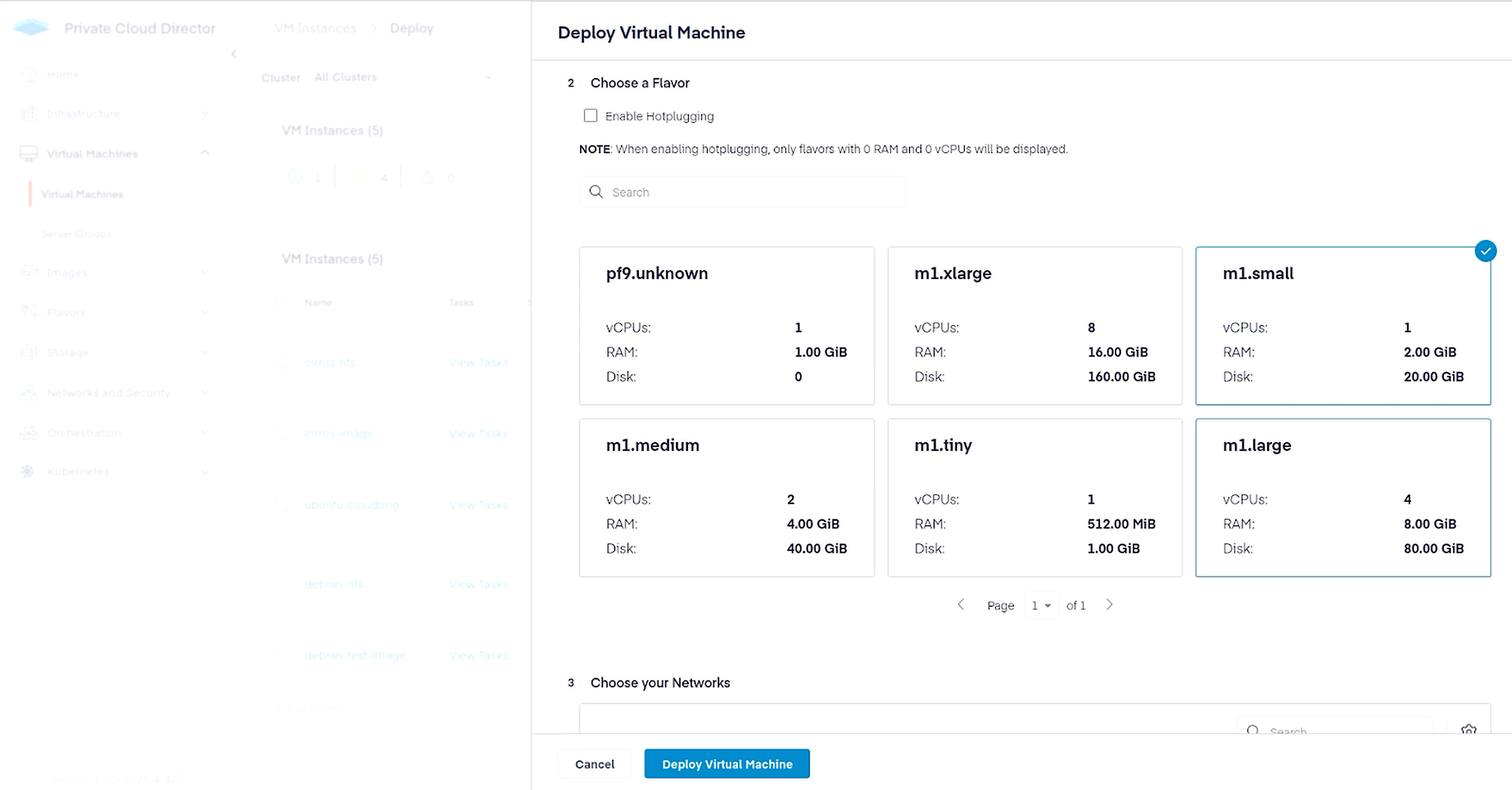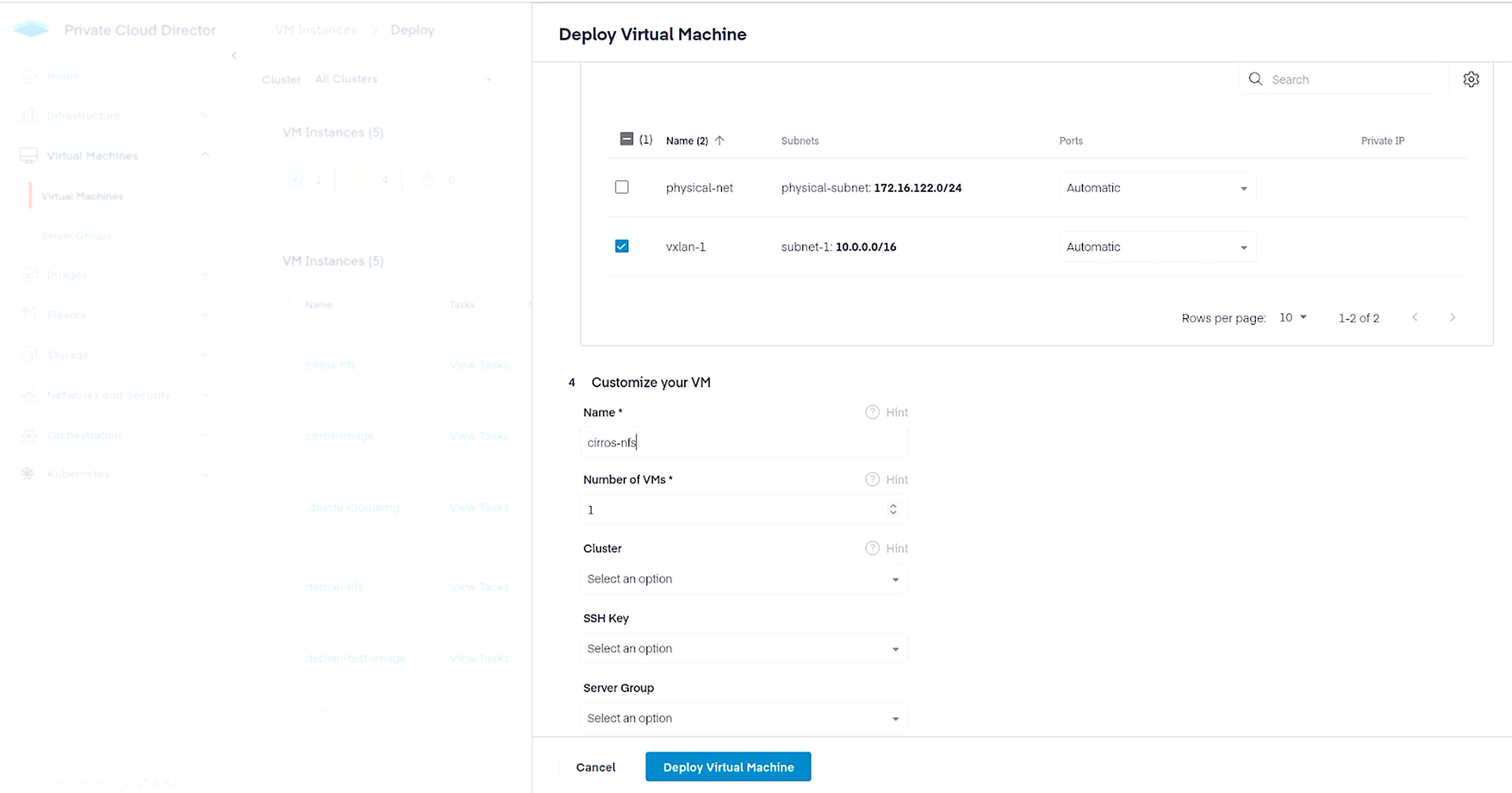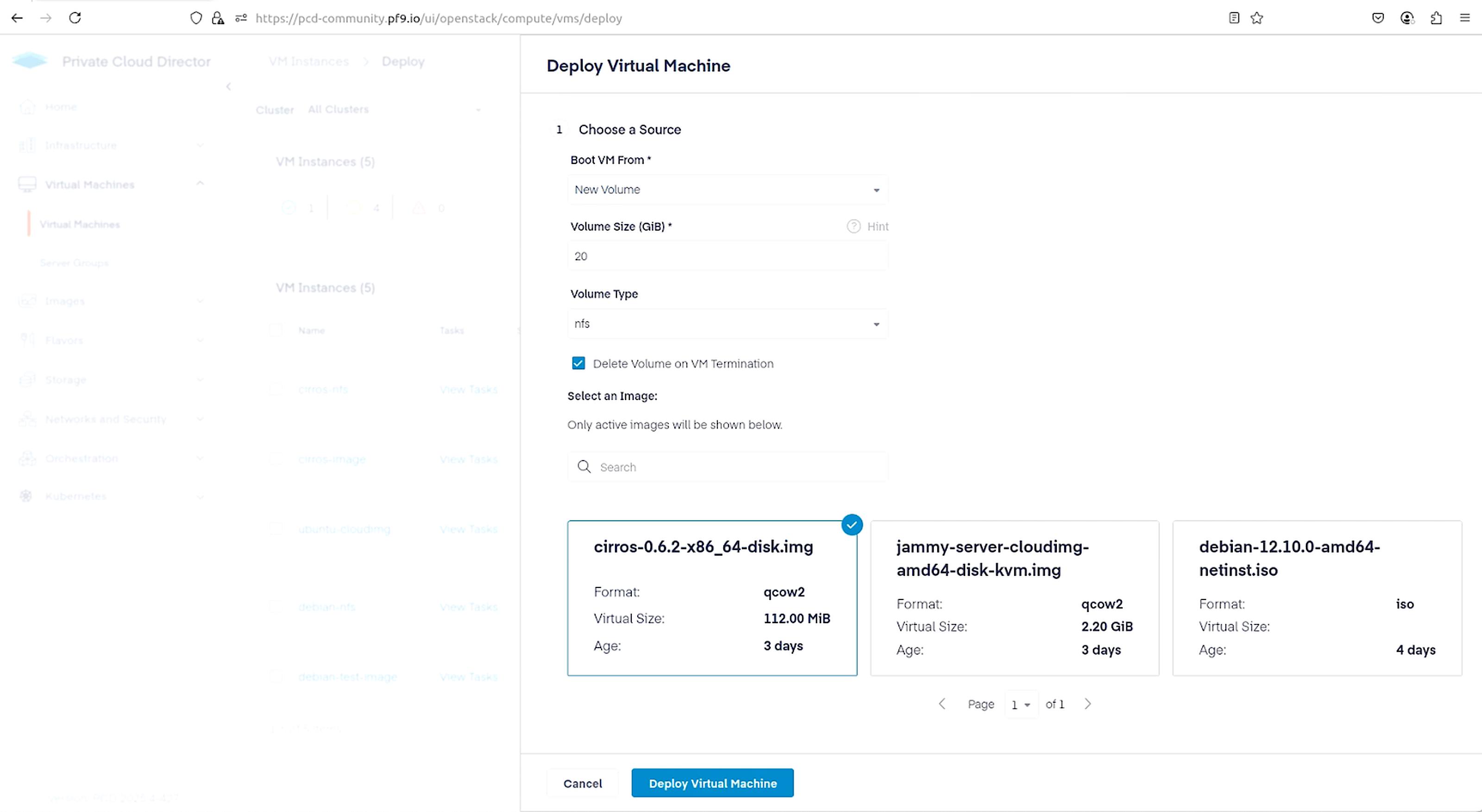 Finally, navigate to Virtual Machines > Virtual Machines and click the Deploy New VM button in the top right corner. Since we want to create this VM with persistent storage, make selections as shown below to use NFS.