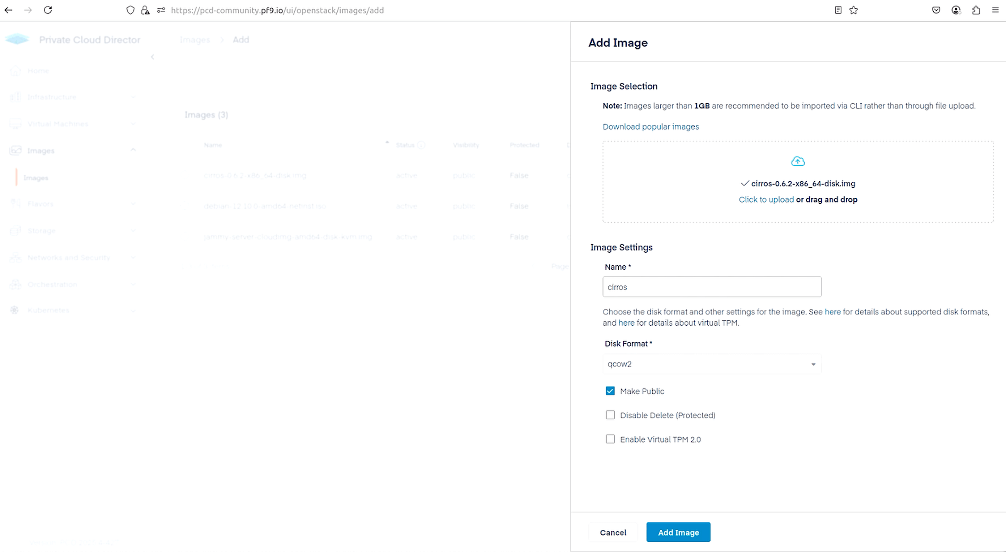 It’s time to spin up a VM on our hypervisor host. First, we upload an image that will be used to create the VM. I am using CirrOS for its small footprint. Navigate to Images > Images and click on the Add Image button in the top right. Select the CirrOS image, make the selections as shown below, and click Add Image.