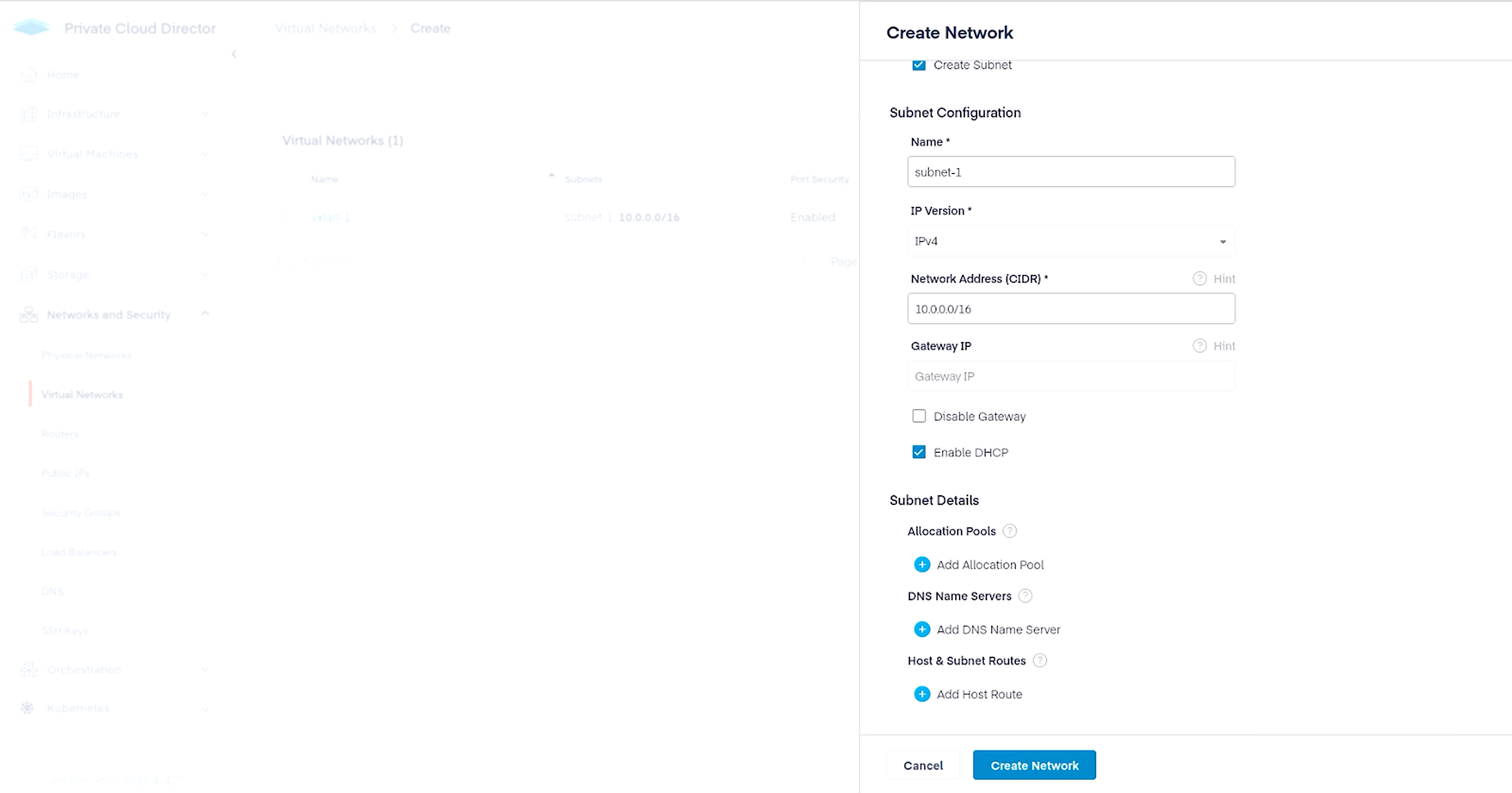 Next, create a virtual network that we will attach to our VM. Navigate to Networks and Security > Virtual Networks and click on Create Network button on the top right. Configure the virtual network as follows.