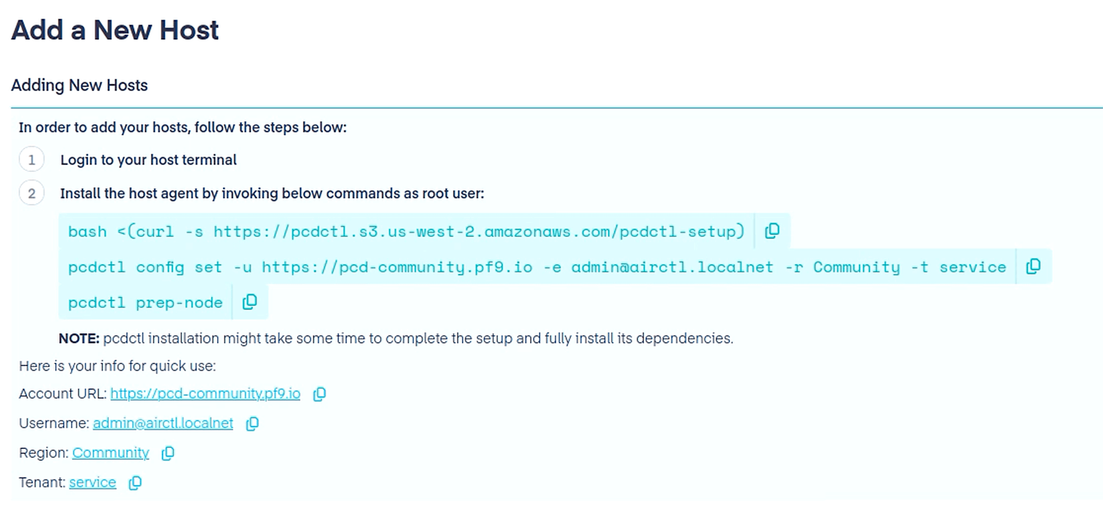 Proceed to execute commands from the UI in your hypervisor host VM to onboard this host to PCD.