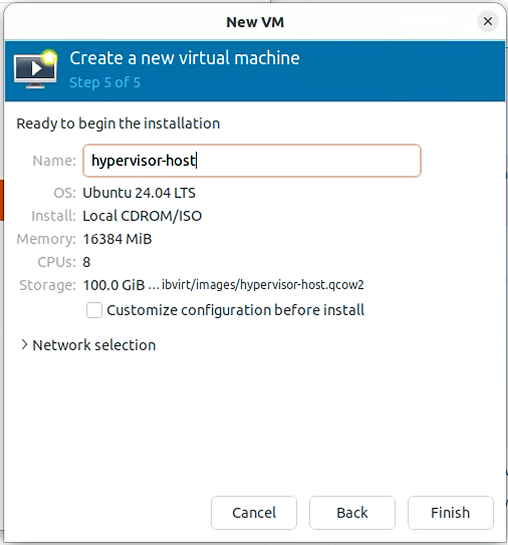 Now we will create a new VM that will serve as our hypervisor host to our workload VMs. Similar to how we created the CE VM, create another Ubuntu Server VM with the following resources: