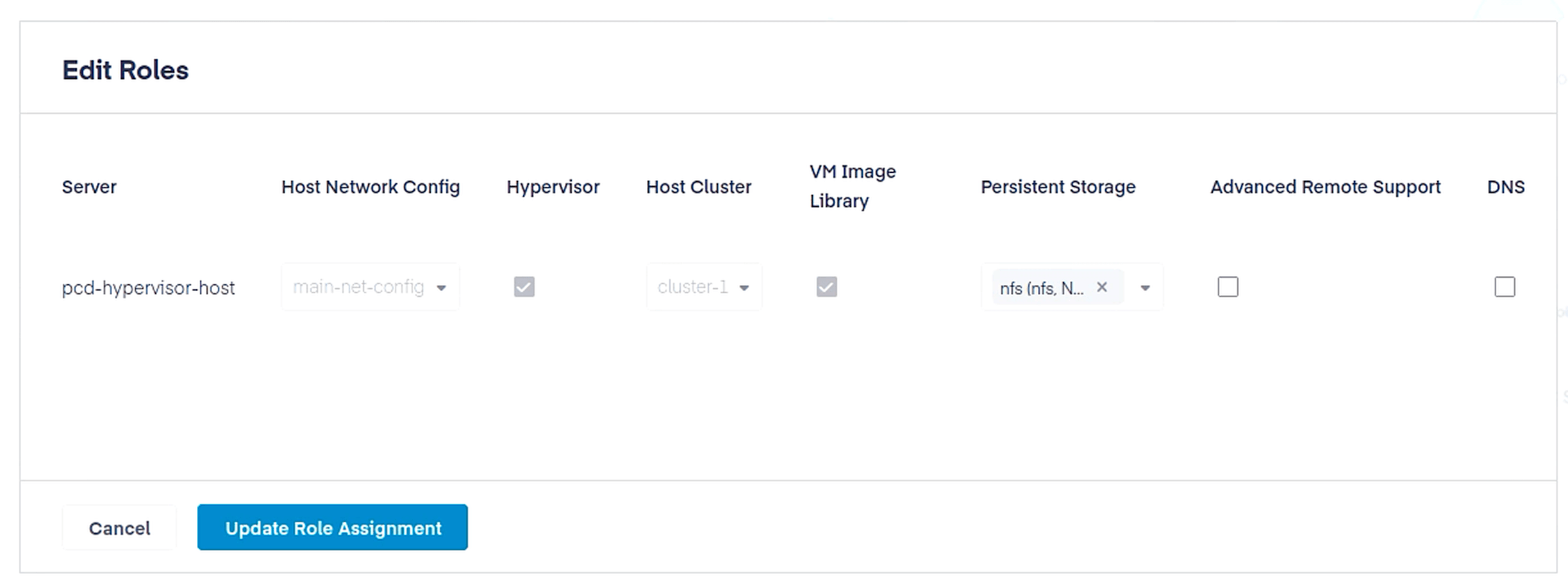 Finally, navigate to Infrastructure > Cluster Hosts, select the host we onboarded a few steps ago, and click Edit Roles. Assign the Hypervisor role to the host by checking the box in the Hypervisor column. Under persistent storage select the NFS configuration we created. Click Update Role Assignment.