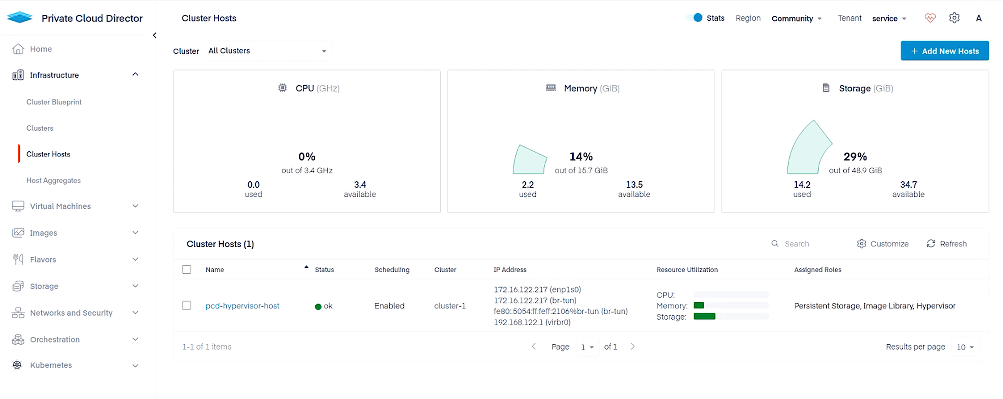 Now we will onboard the new hypervisor host onto PCD. Navigate to Infrastructure > Cluster Hosts > Add New Hosts button on the top right.