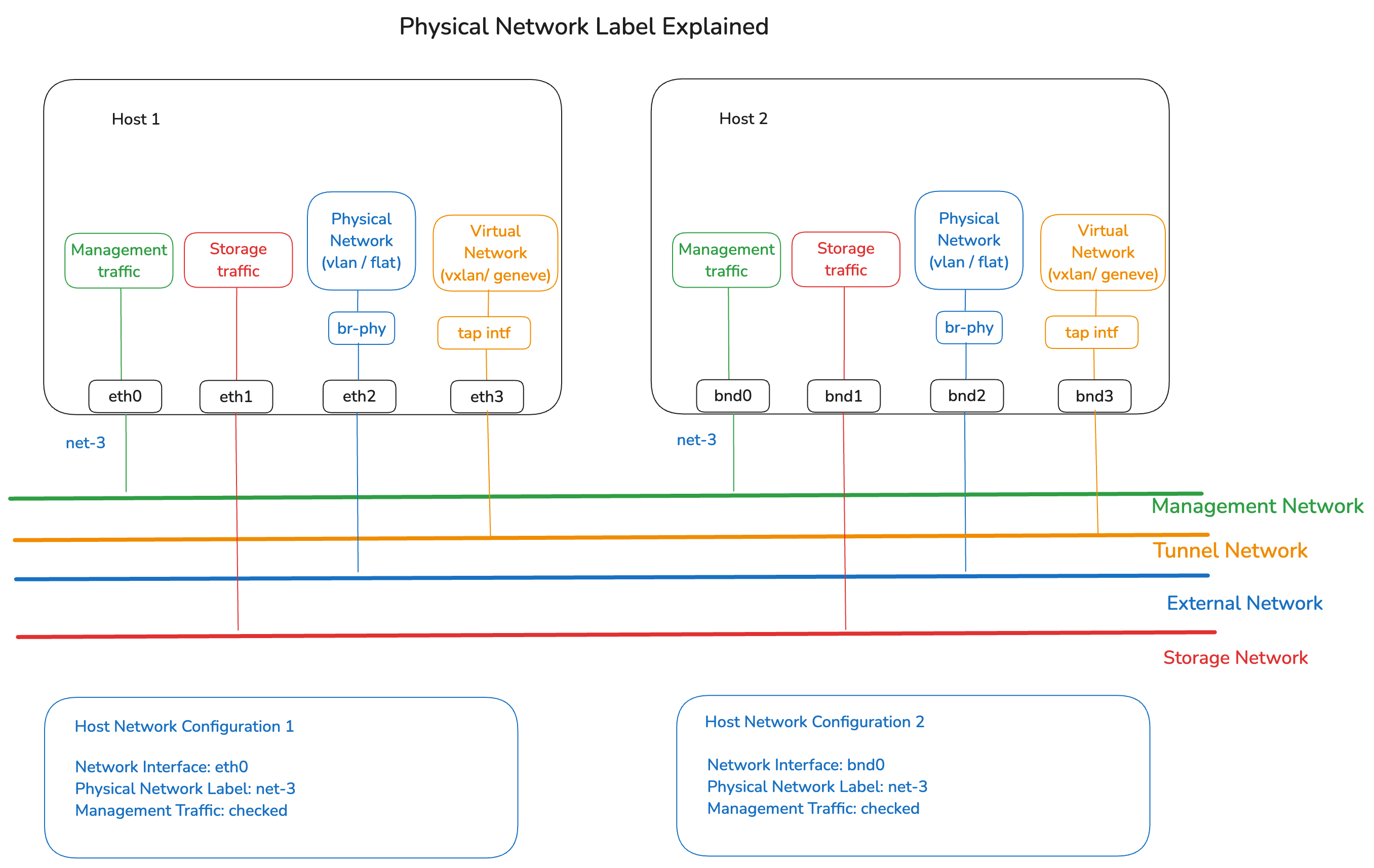from first set of hosts and bond0 from second set of hosts for management traffic because they are both connected to the management network. You will do this by creating two separate Host Network Configurations, one for the first set of hosts and another for the second. But in both, you will provide the same Physical Network Label for eth0