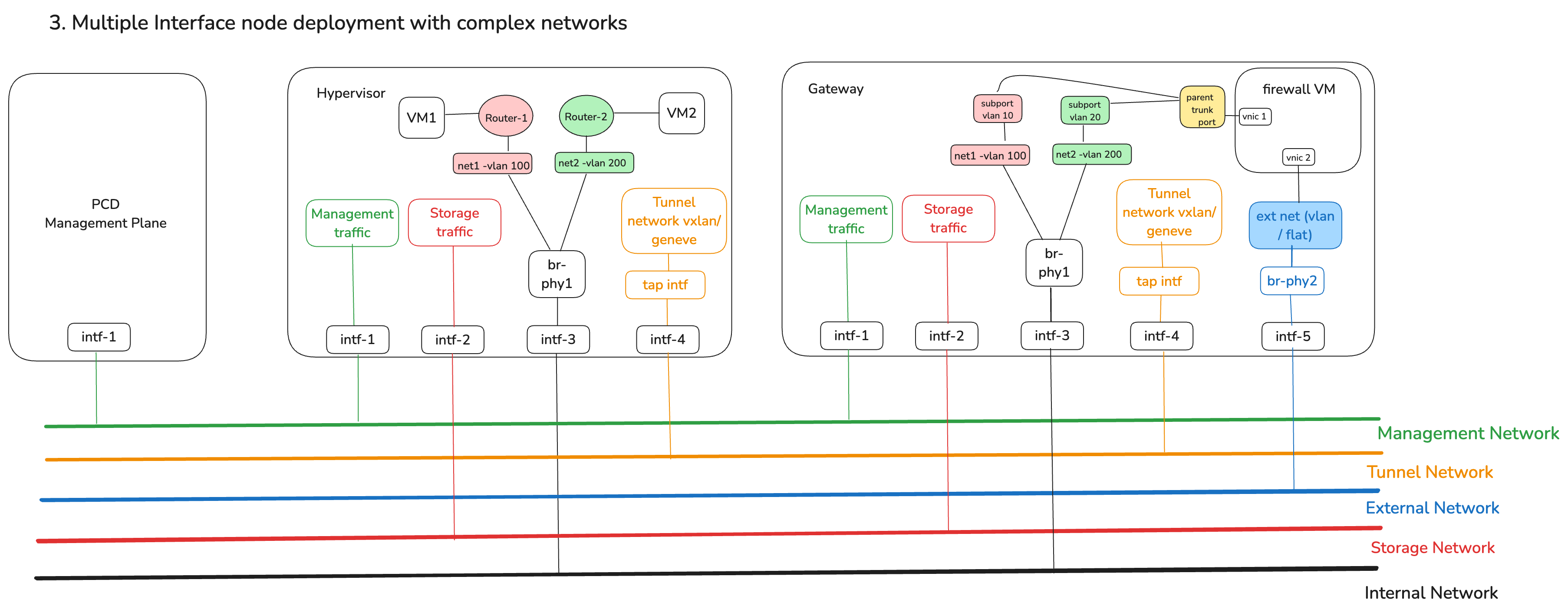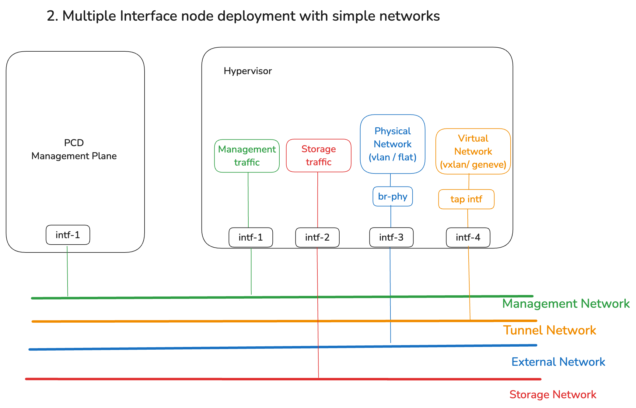 - Isolation and improved QoS is achieved by using separate interfaces for management network, tunnel networks (virtual networks), external network and storage network.