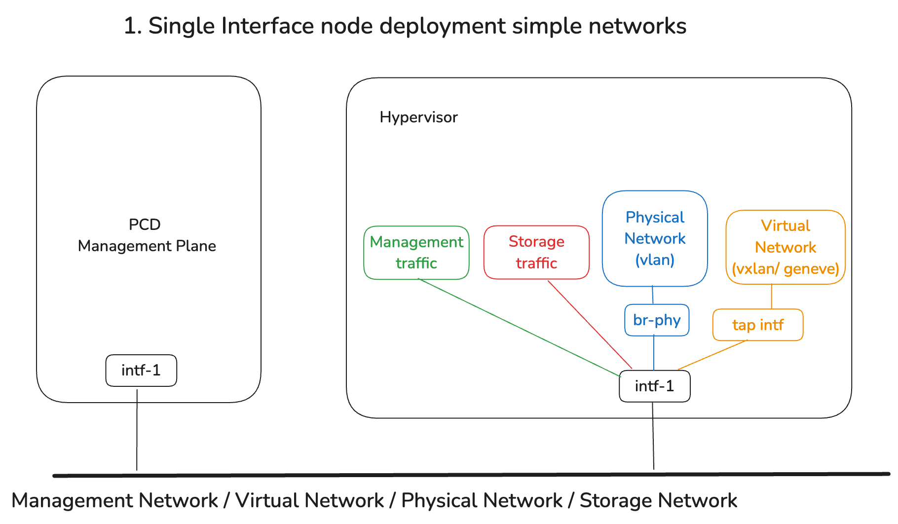 In this architecture, a single physical network interface (either single physical or a single bonded interface) is used to carry all network traffic on an existing physical network: