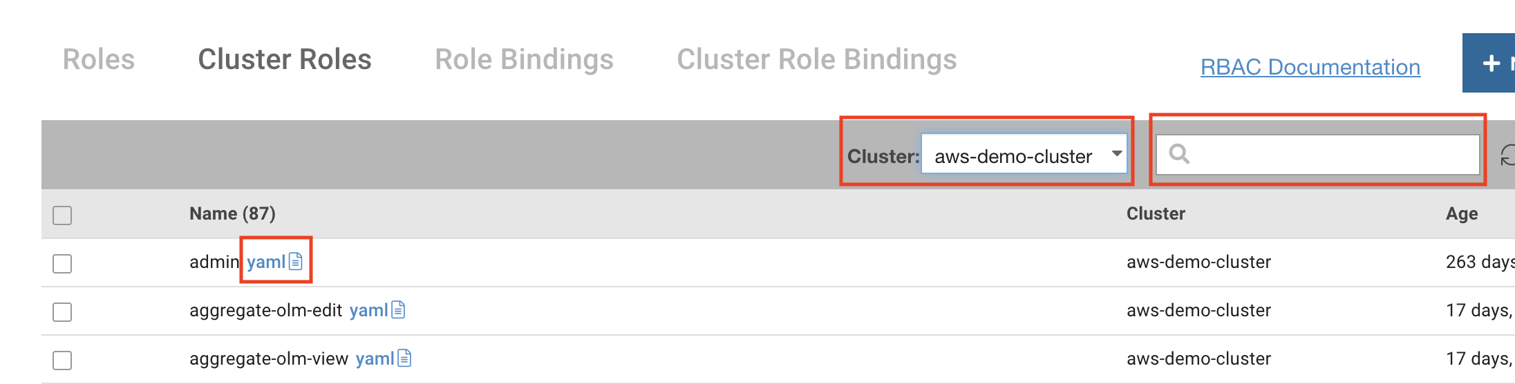 3. Click the yaml link for the ClusterRole whose YAML you wish to download.