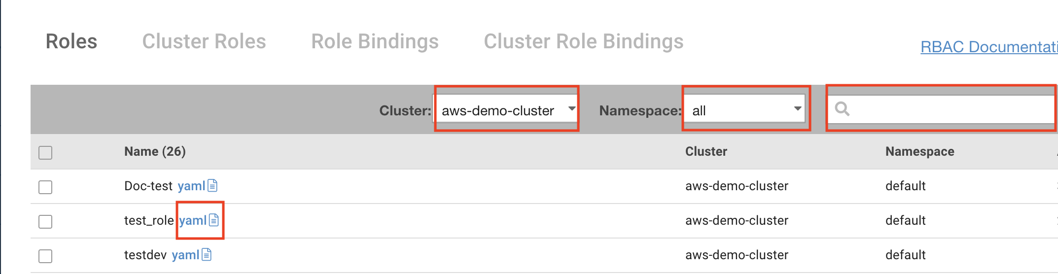 2. Select a Cluster and/or Namespace to display a list of Roles for the cluster. Alternatively, search the Role by typing in the name in the Search box.