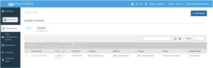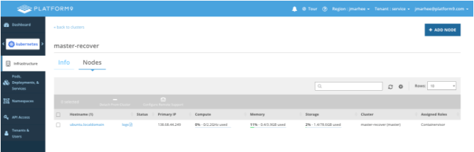 /home/pf9-user/platform9-install-your_user-platform.sh:  file.managed:    - source: salt://files/platform9-install-your_user-platform.sh    - user: pf9-user    - group: pf9-user    - mode: 644Pf9 Setup:  cmd.run:    - name: sudo bash platform9-install-your_user-platform.shWhen the script exits, if it completed without error, it will attempt to contact the Platform9 control plane, authorized as the original master’s host ID, and if a match exists between the hostname, IP, and host_id, it will re-register as the cluster master: