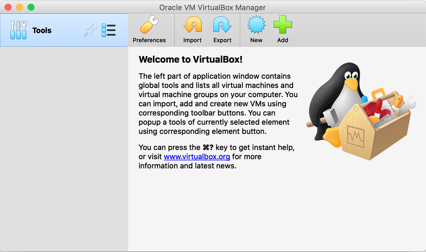 Launch VirtualBox. It will be a clean slate to start building your new virtual machine.