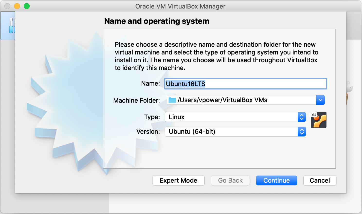 Next click the blue “New” button to create a new virtual machine. Select Linux and Ubuntu for the options, and choose a name that makes sense for you.