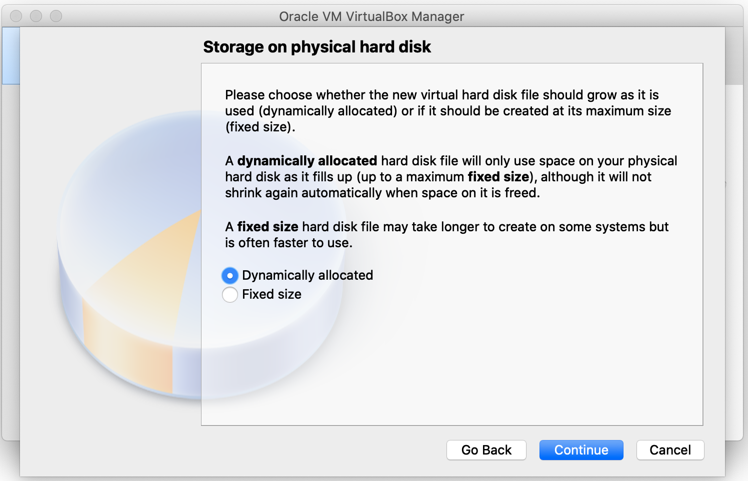 Next, let it create a virtual disk (it doesn’t matter which format) and dynamically allocate the space. The more disk space you can allocate the better – 20+GB fills up fast when you start to play with container images in Kubernetes. Click “Create” after going through these screens.