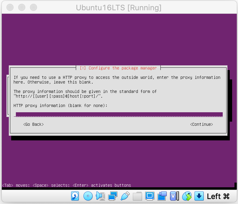 The next screen that prompts for information asks for a proxy, which you can just leave empty to continue.