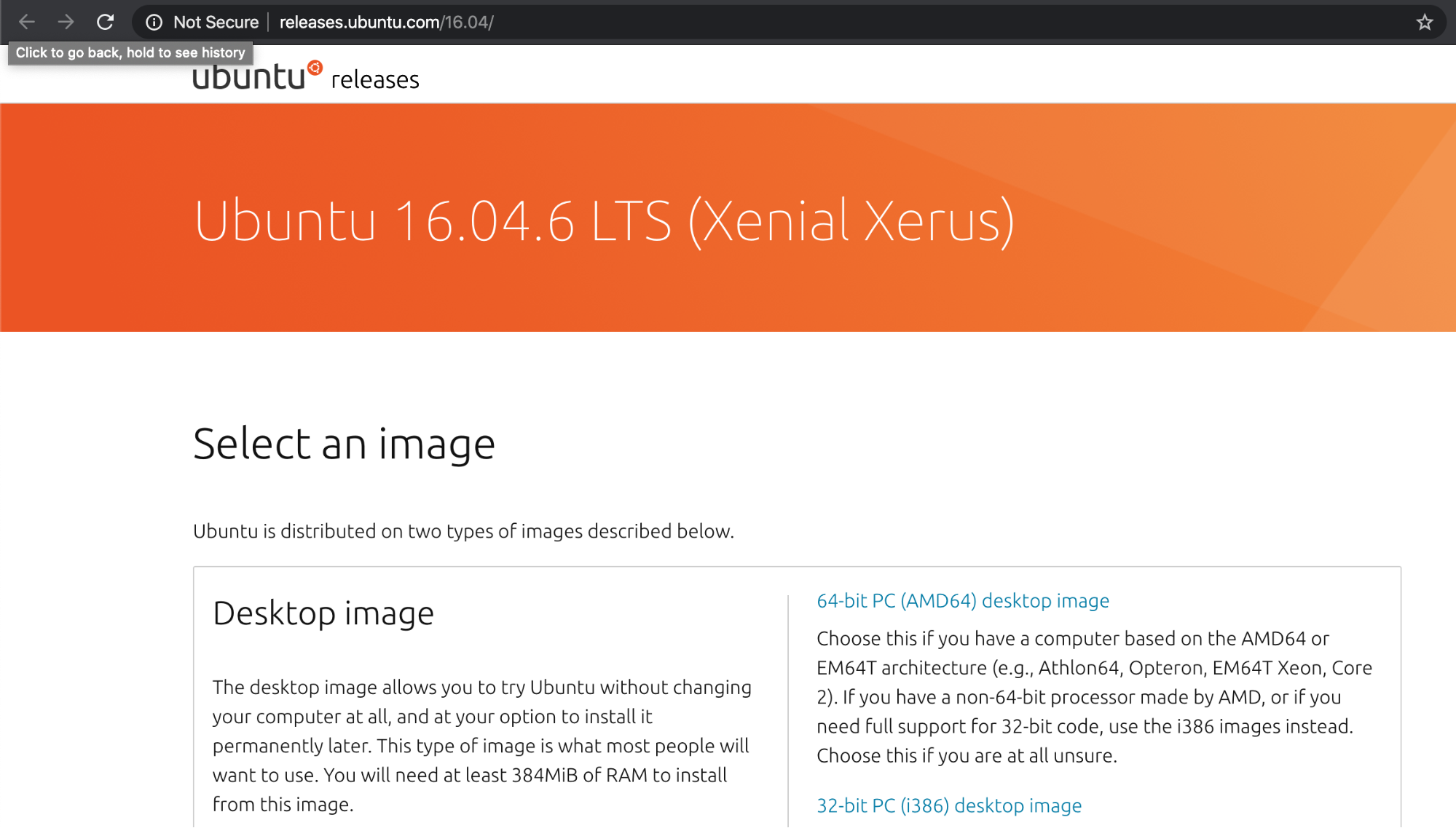 In a web browser, go to http://releases.ubuntu.com/16.04/ and scroll down to the “Server” download section to get the “64-bit PC (AMD64) server install image” image. This will take a few minutes, as it is 873Mb.