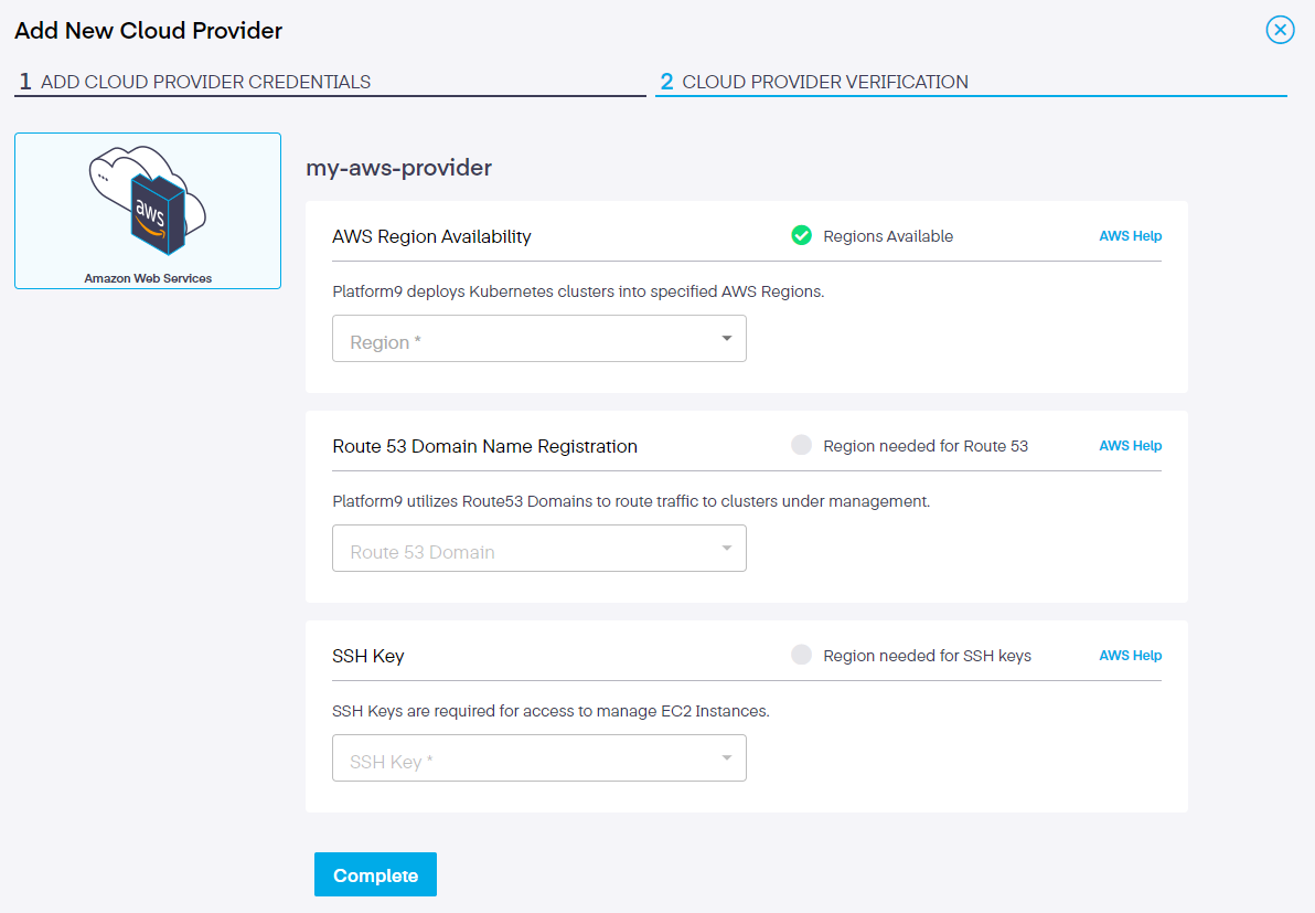 Platform9 – UI - AWS - Validating Cloud Provider Access
