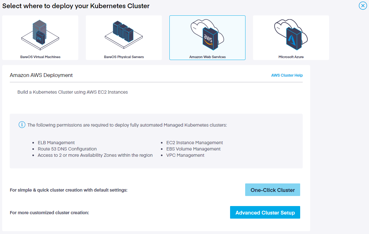 From your dashboard, click the "Add Cluster" button and choose "Amazon Web Services" as your infrastructure provider. Choose the "One-Click Cluster" button to get started.