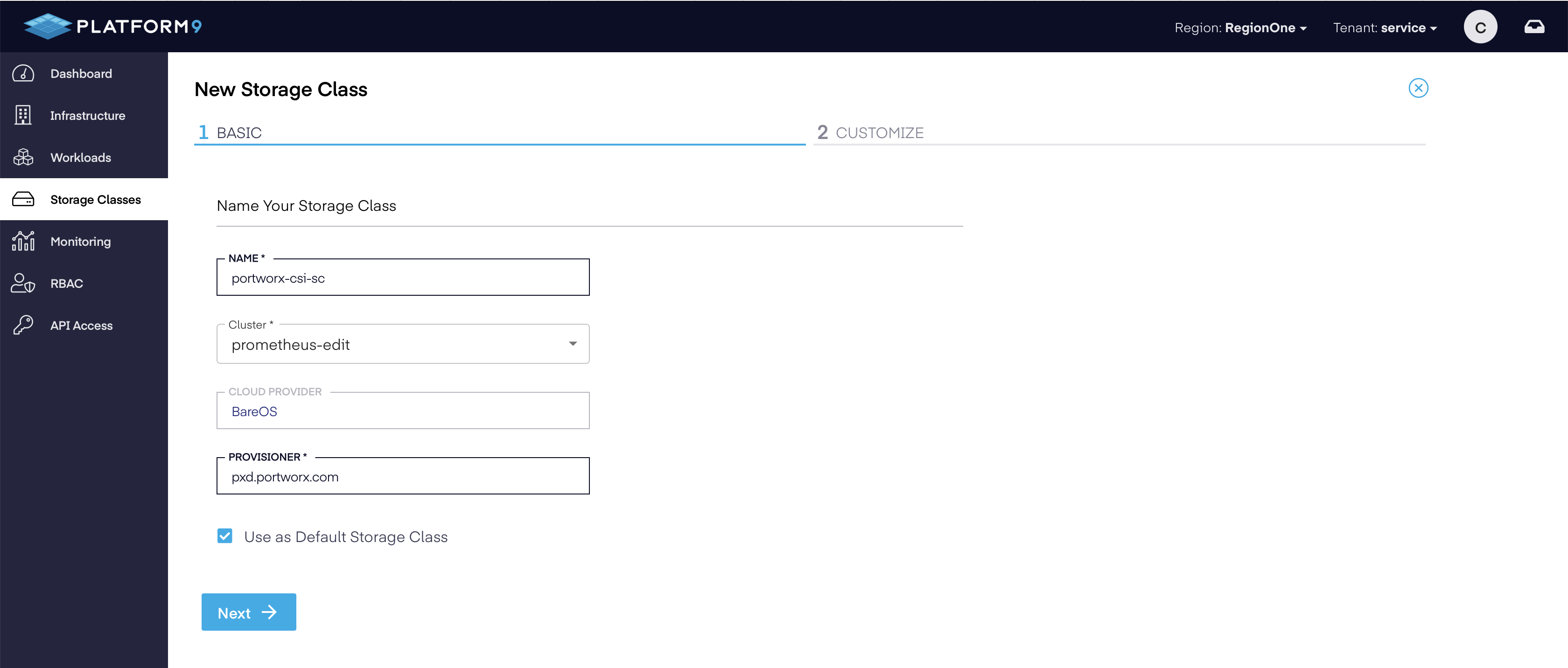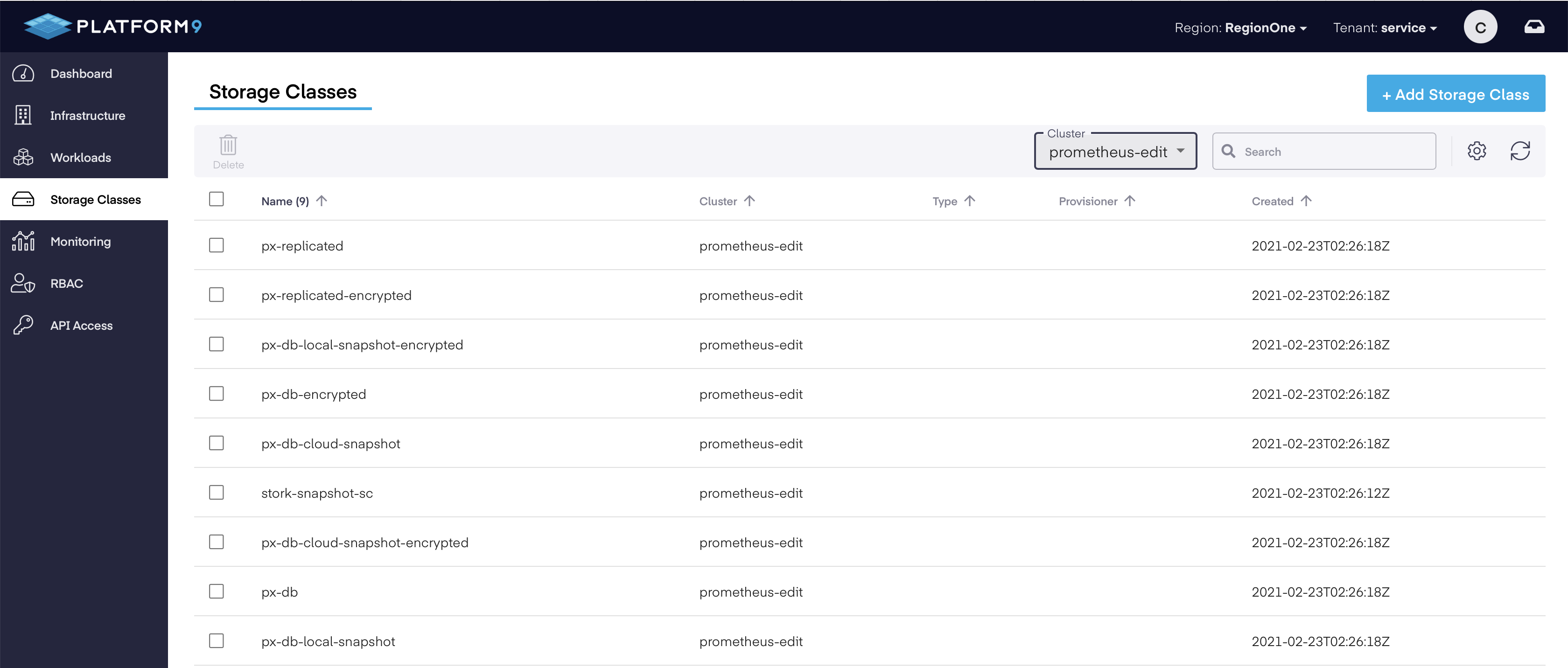 Once Portworx is running you need to create a storage class with the fowling configuration, this can be applied via the Platform9 SaaS Management Plane using the Storage Class dashboards.