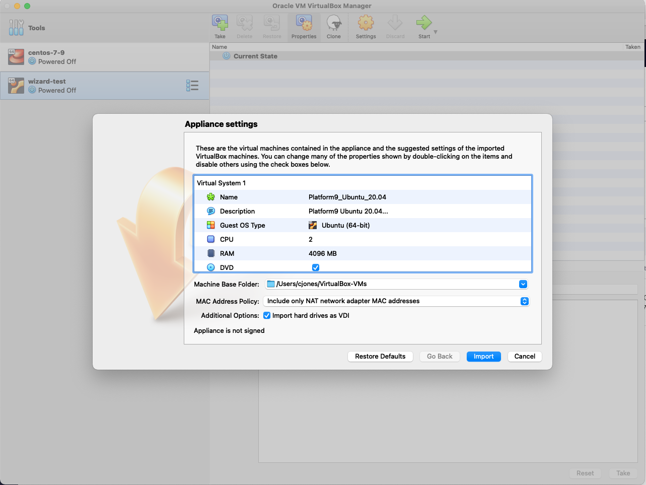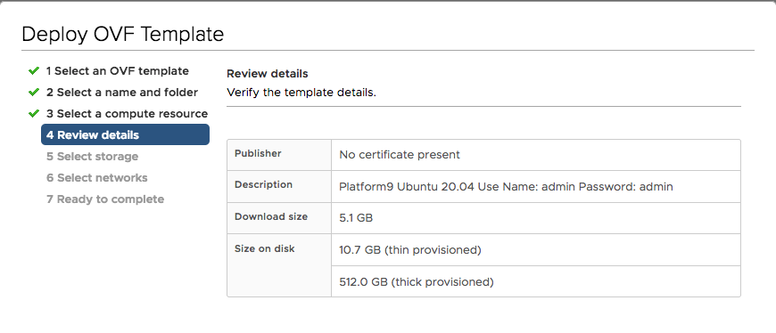$ /Applications/VMware\ OVF\ Tool/ovftool --lax Platform9_Ubuntu_20.04.ova-SHA256.vmx Platform9_Ubuntu_20.04_hw13.ova-SHA256.ovaNow you should be able to deploy the OVA file without any errors.