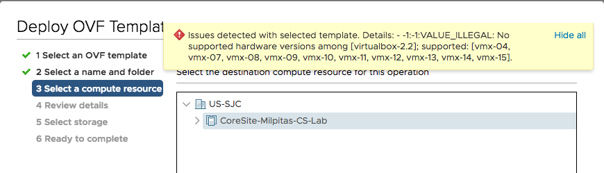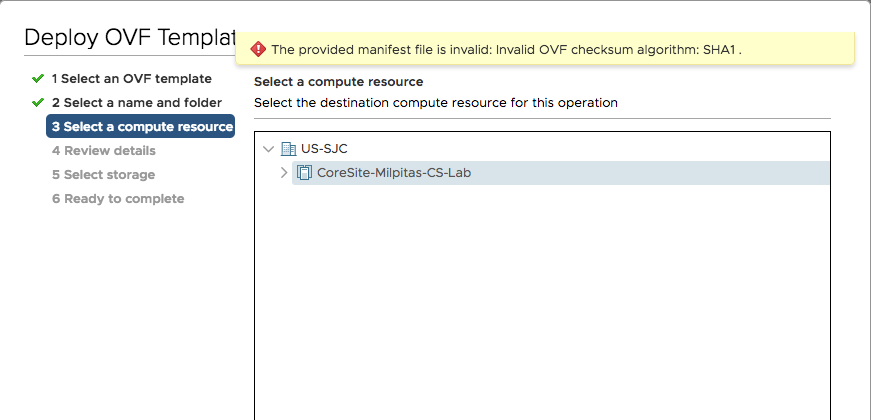 If you are receiving the following error when trying to deploy the OVA in VMware vCenter, use the following steps as a temporary guide to address this issue until the new OVA supporting VMware is published next week.