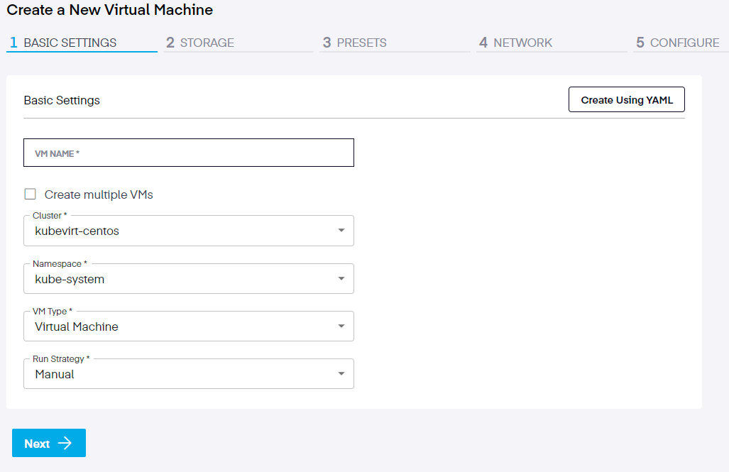 We begin by naming our VM. In this instance. Next, choose whether you will be creating a single or multiple VMs. If multiple, click the Create multiple VMs check box. Next, select the cluster and namespace the instance will be connected to, as well as the Run Strategy. There are four run strategies to choose from: