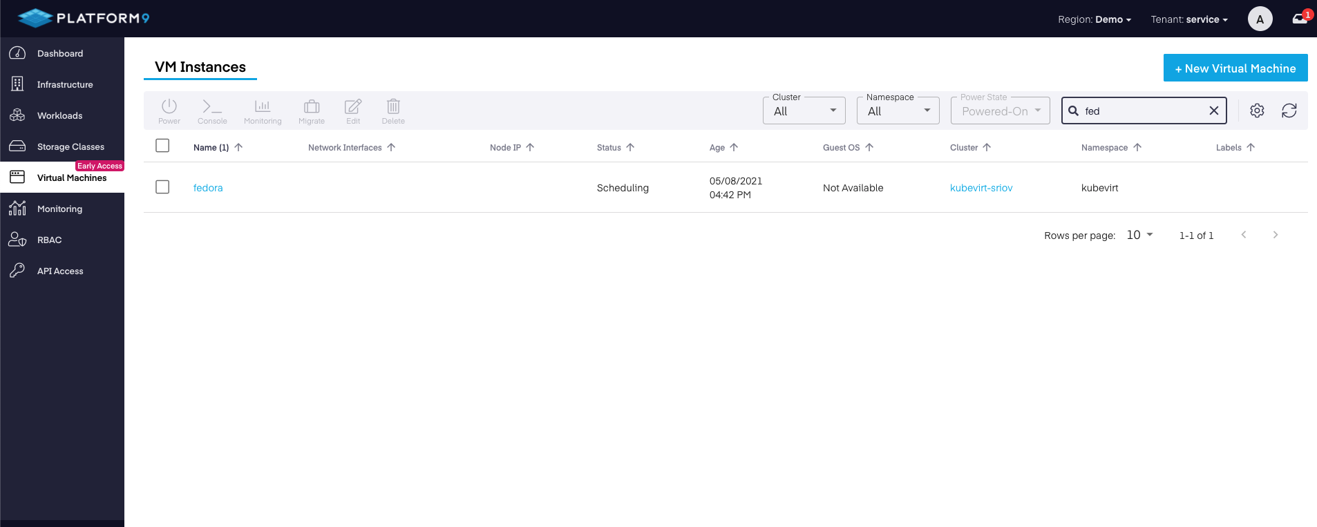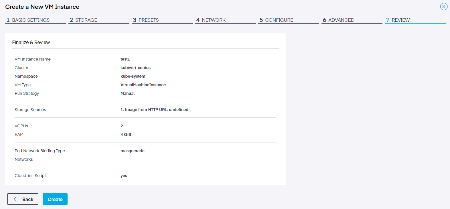 Below is a copy of the default YAML file we used. This can be utilized for testing in this environment. This example uses a fedora cloud image with cloud-init. To understand the details and more advanced options, refer to this section of the official KubeVirt User Guide. Add this sample Fedora VirtualMachine YAML into the VM creation wizard box.