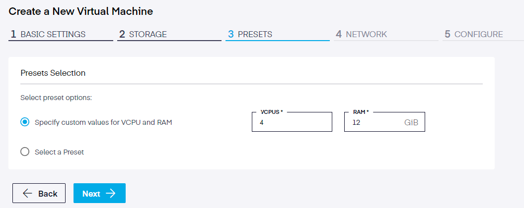 In this step, users select one of two options; either a preset value or manually define values for the number of VCPUs and amount of RAM.