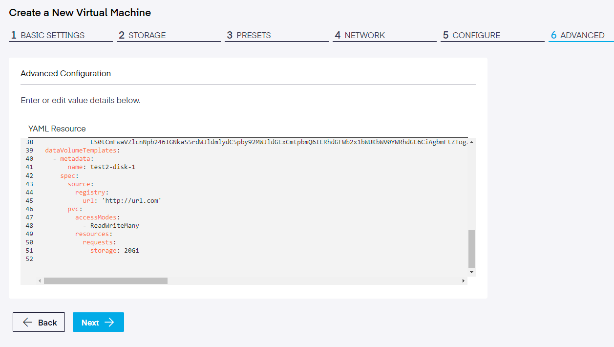 In this section, further details can be added via a YAML file. Below, we appended an additional dataVolume.
