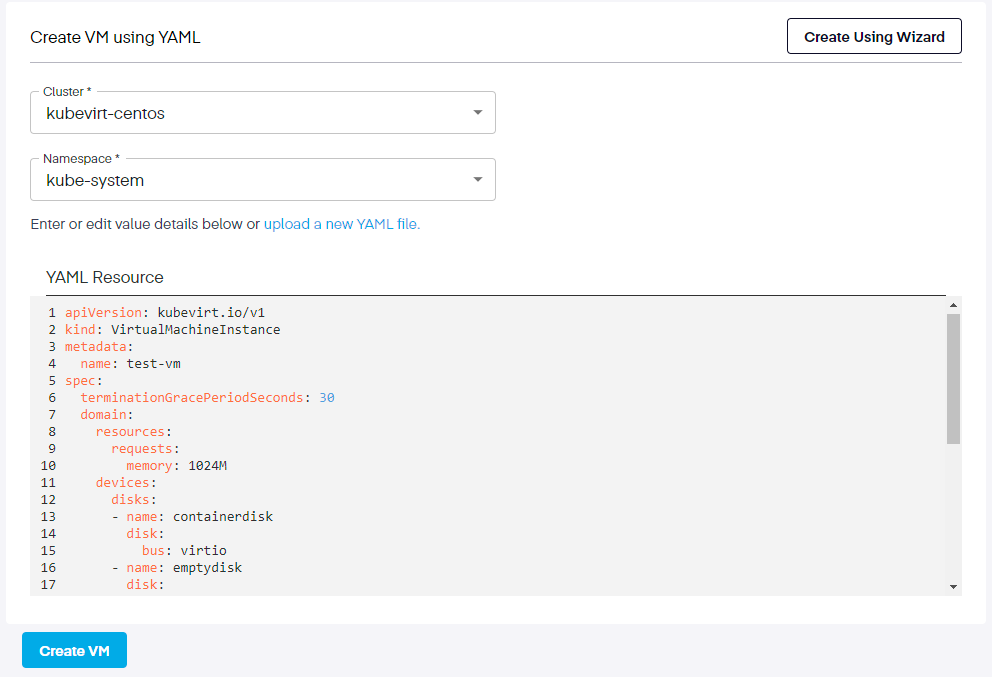 apiVersionkubevirt.io/v1kindVirtualMachineInstancemetadata nametest-vmspec terminationGracePeriodSeconds30 domain resources requests memory1024M devices disksnamecontainerdisk disk busvirtionameemptydisk disk busvirtiodisk busvirtio namecloudinitdisk volumesnamecontainerdisk containerDisk imagekubevirt/fedora-cloud-container-disk-demolatestnameemptydisk emptyDisk capacity"2Gi"namecloudinitdisk cloudInitNoCloud userData- #cloud-config passwordfedora chpasswd expireFalse Your YAML file must be syntactically correct, or it will throw an error message stating: Provided YAML code is invalid.