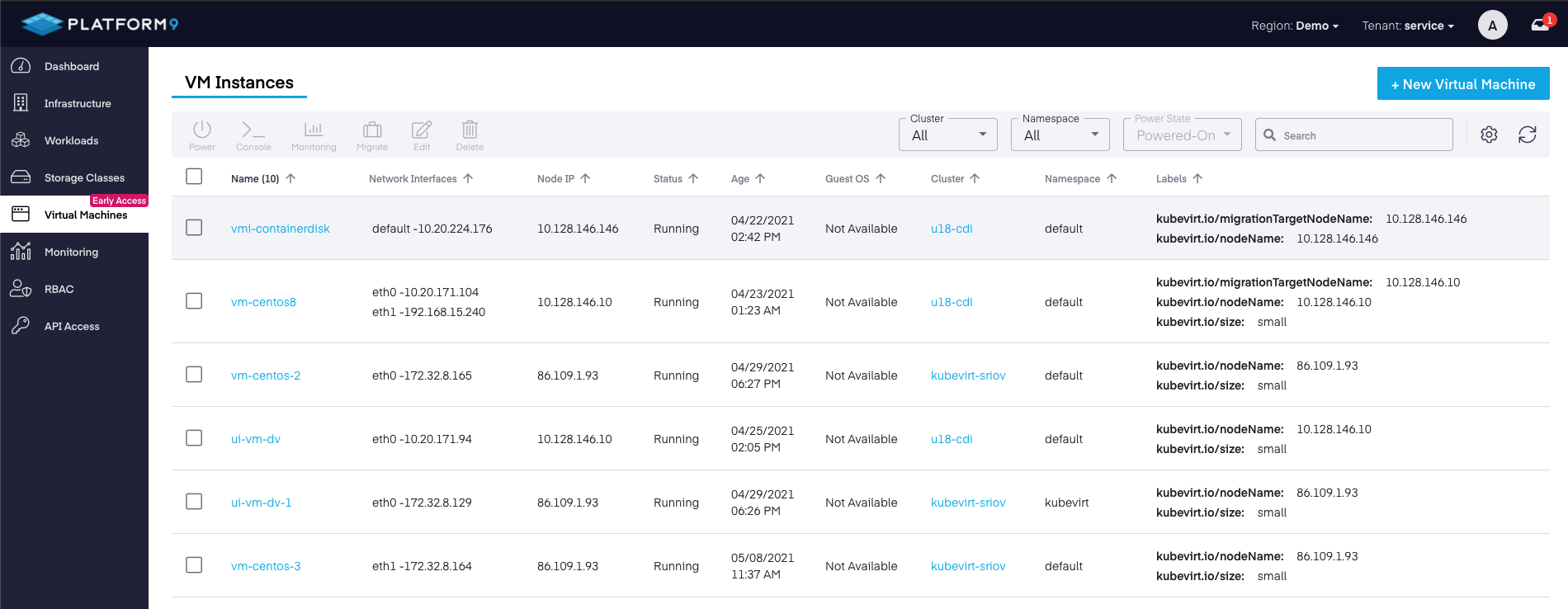 Once you've enabled KubeVirt in your Kubernetes cluster via the PMK console cluster creation wizard, let's begin creating your first VM. We begin by navigating to the Virtual Machines section in the console.