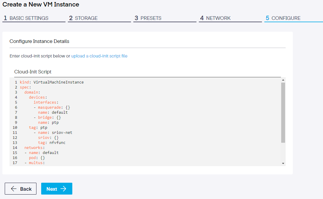 Kubevirt utilizes cloud-init as a sort of templates, similar to a kubevirt VM or VMI yaml config. these can be a useful tool, especially when debugging test cases. Here, users can either enter a cloud-init script or upload a cloud-init file.