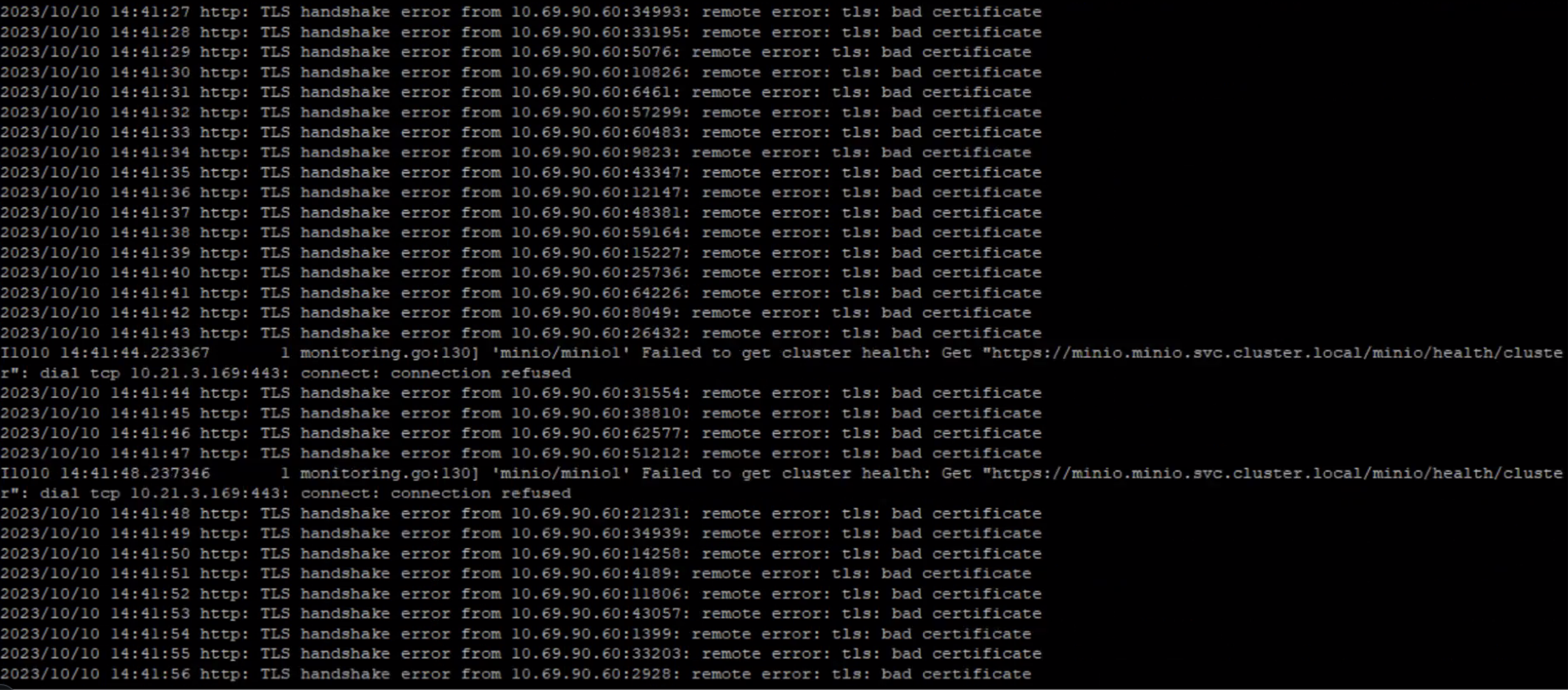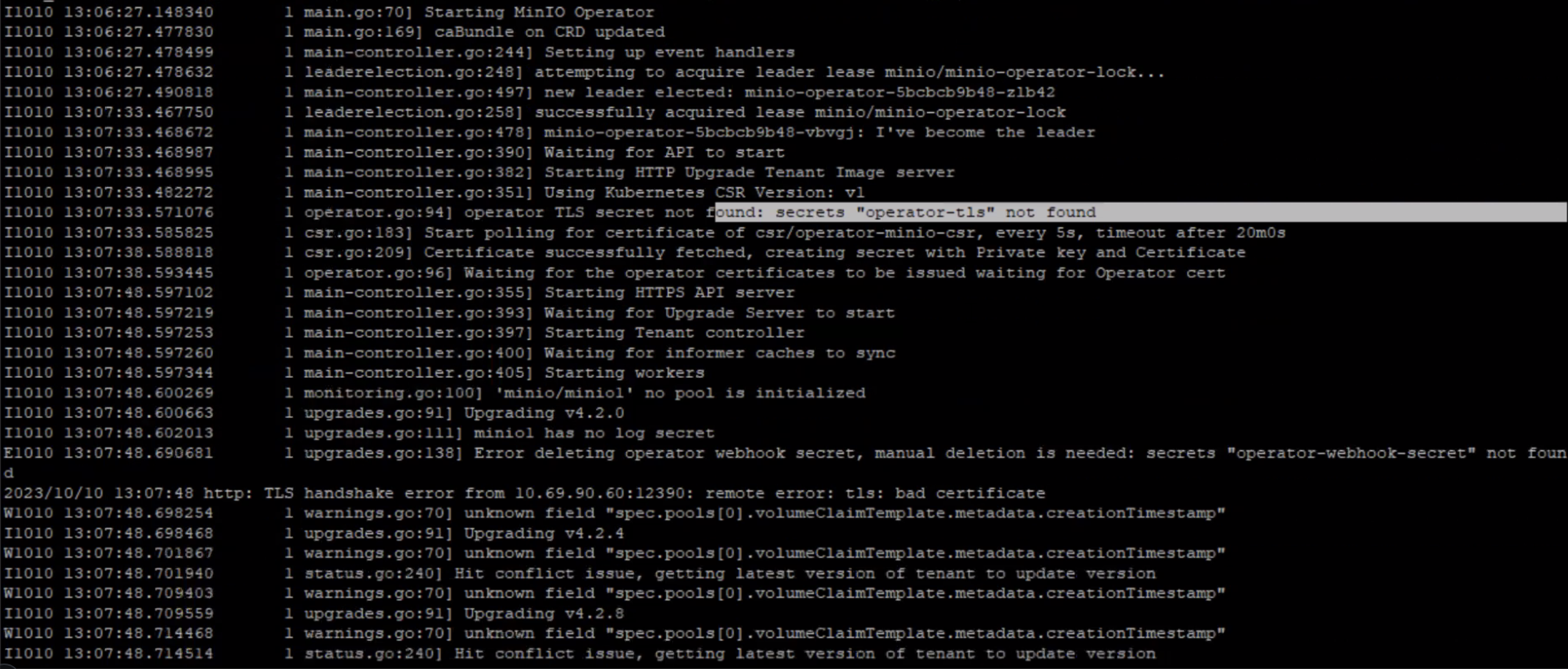 NAMESPACE NAME READY STATUS RESTARTS AGEminio console-59d679474-7fzvr 0/1 Completed 0 29hminio console-59d679474-klt79 0/1 ContainerStatusUnknown 0 170mminio console-59d679474-x9nbq 0/1 ErrImagePull 0 143mminio minio-operator-5bcbcb9b48-fhr8k 1/1 Running 8 (102m ago) 29hminio minio1-pool-0-0 0/1 ContainerCreating 0 159mThe errors seen in the minio pod logs are: